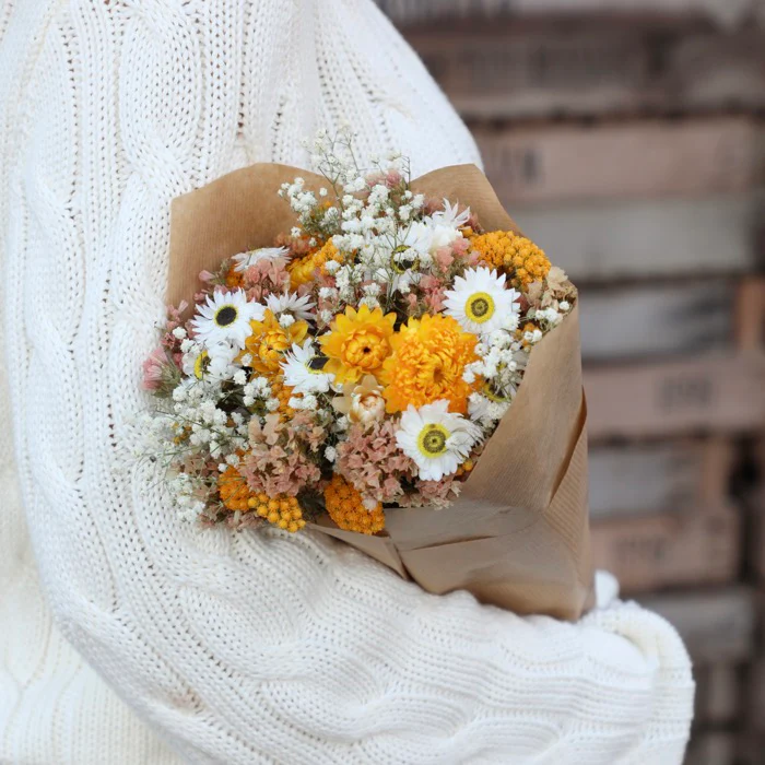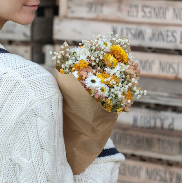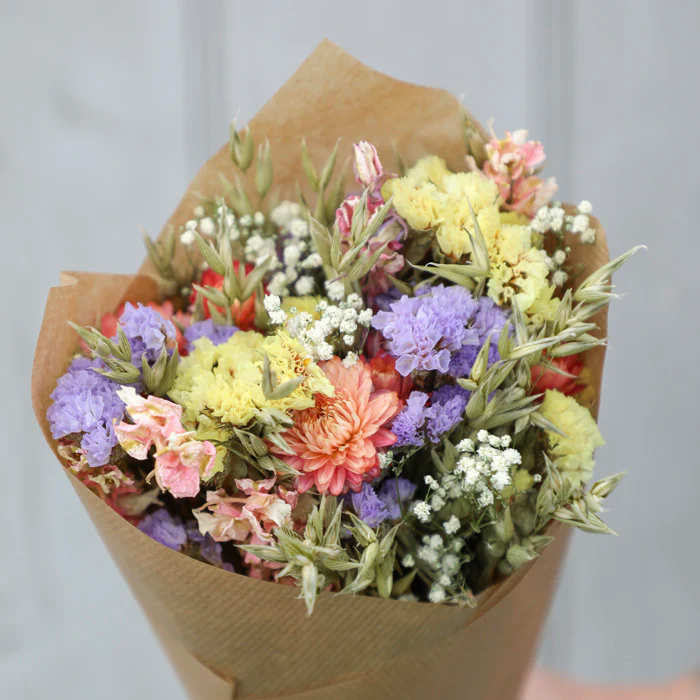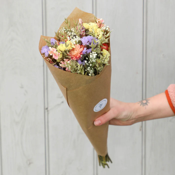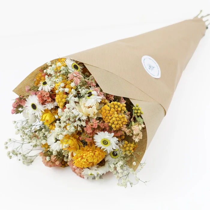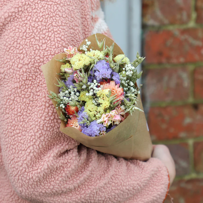 The mini wildflower dried bouquet is a delicate dried flower bouquet in seasonal colours. Created using a variety of dried flowers such as ixodia, broom, gypsophelia, limum, helichrysum and lavender. Wrapped in Kraft paper. The approximate length of these bouquets is 40-50cm. At the widest part, bouquets are approximately 20-25cm. Seasonal availability can vary the flower selection.