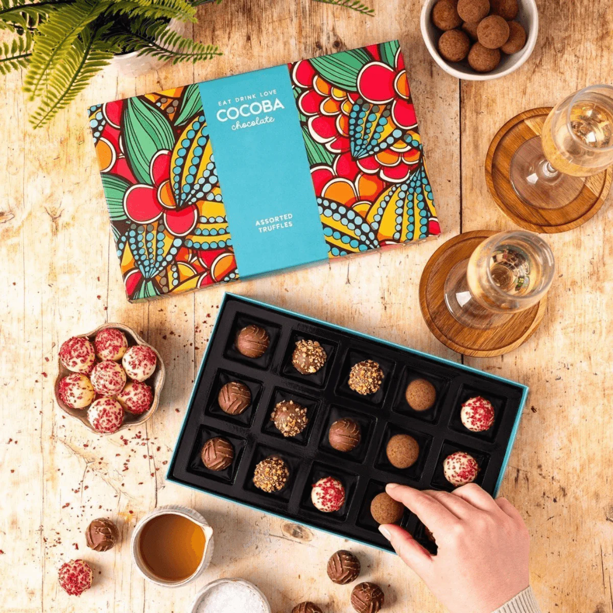 15 Assorted Truffles Gift Box 180g. A careful selection of 15 of Cocoba best selling chocolate truffles, presented in a beautiful gift box.